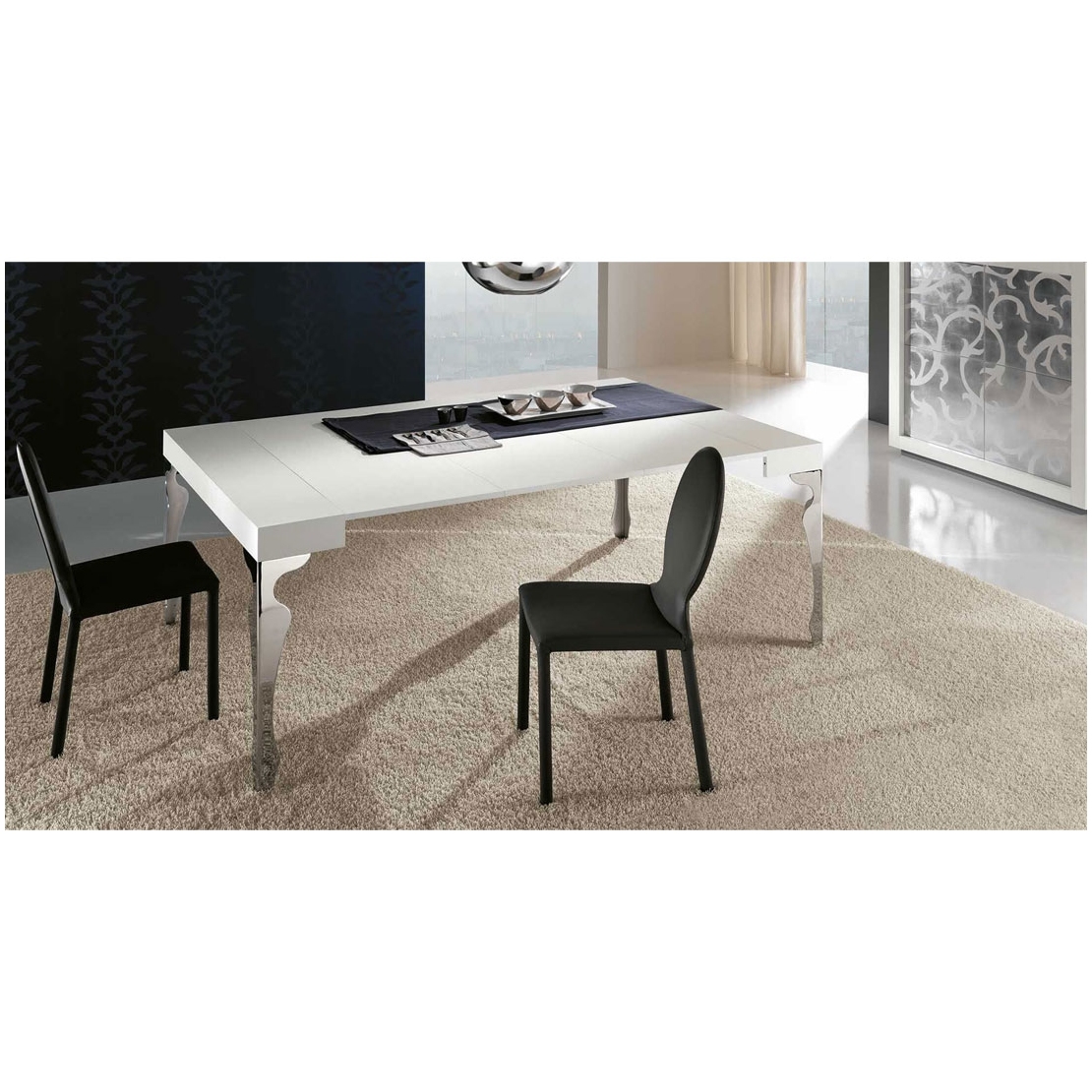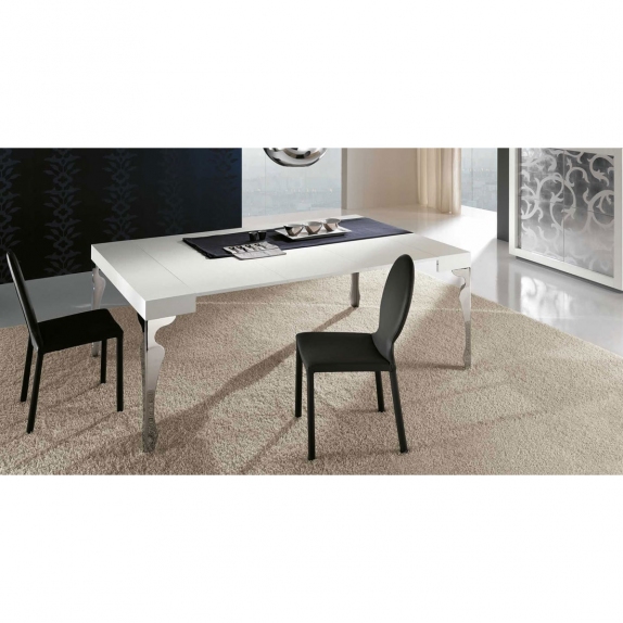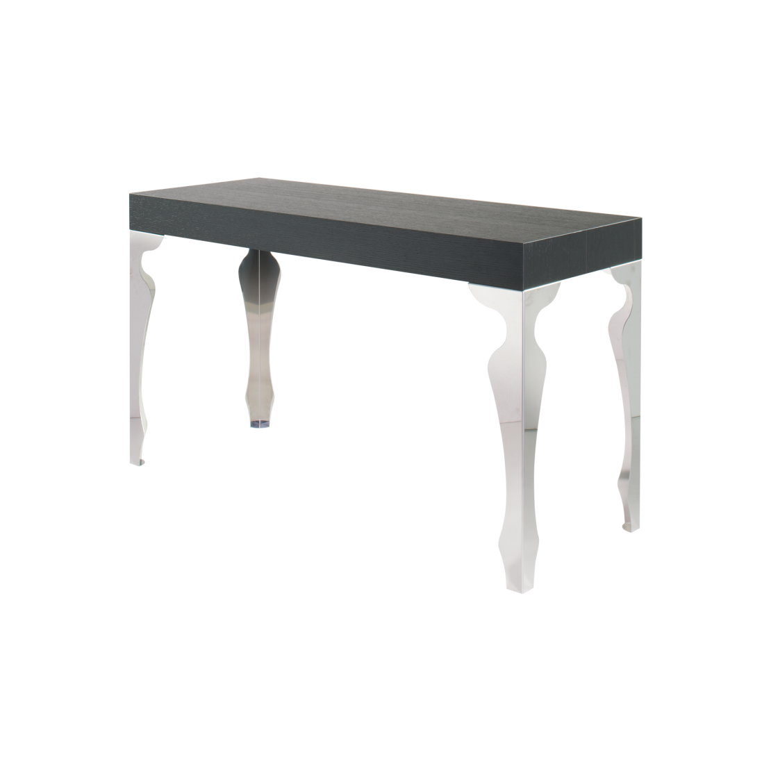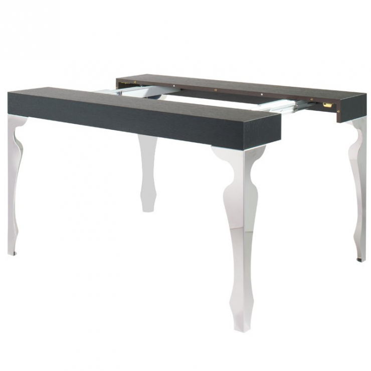 The Luxury extendable console has a wooden top and shaped legs in chromed steel with an anodized aluminum extension mechanism. Bags for internal extensions supplied.