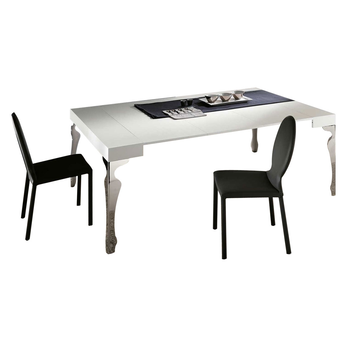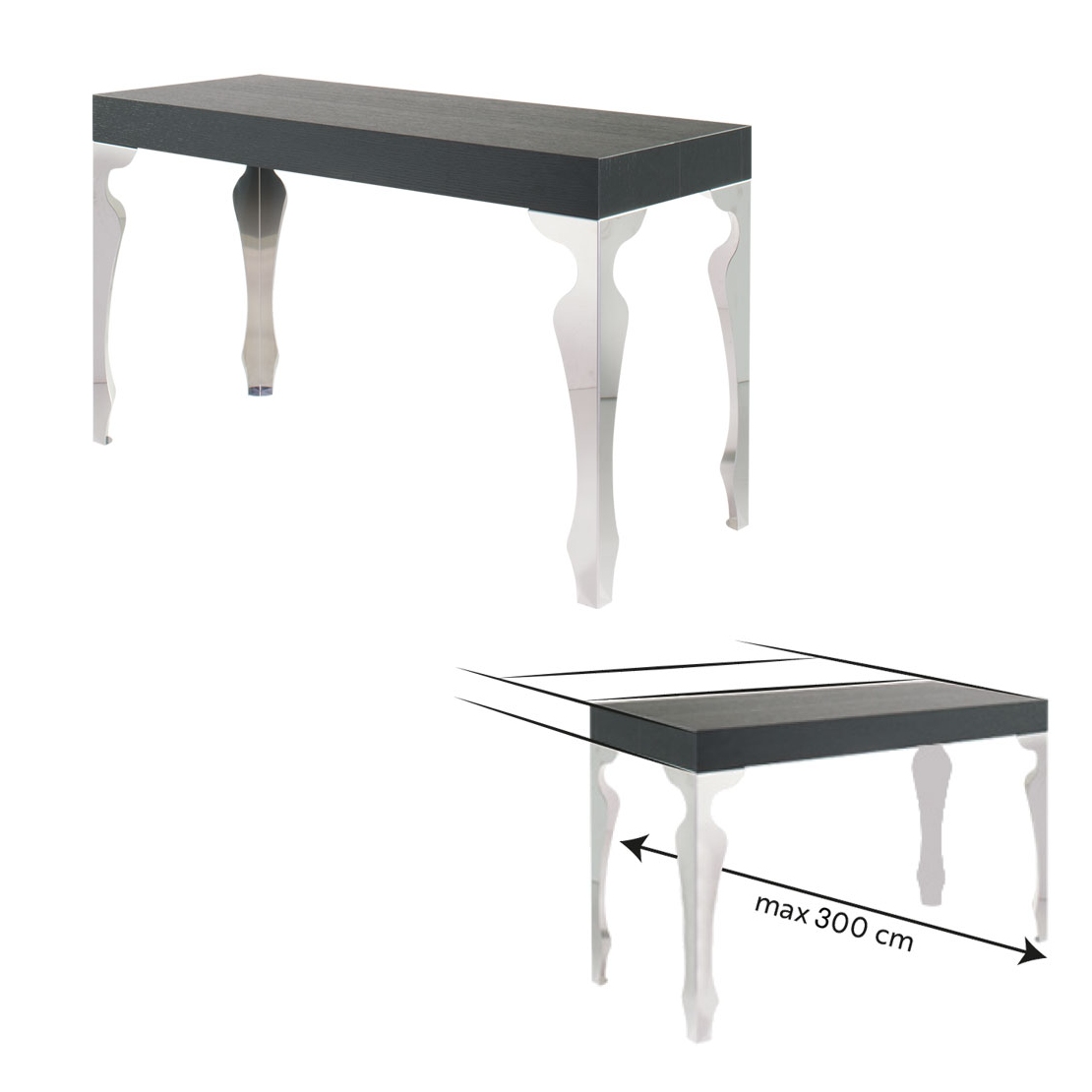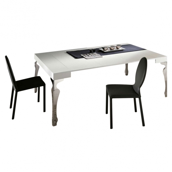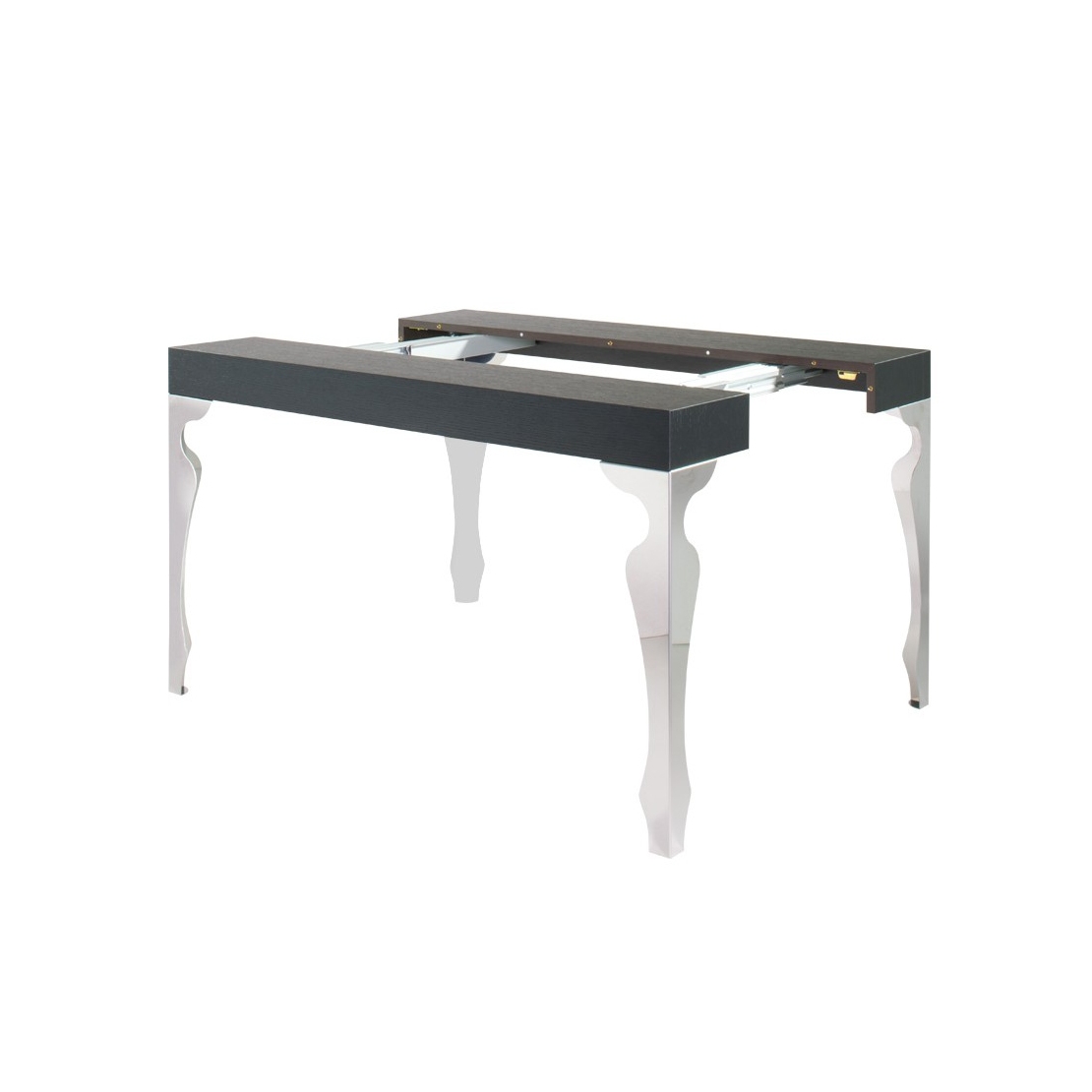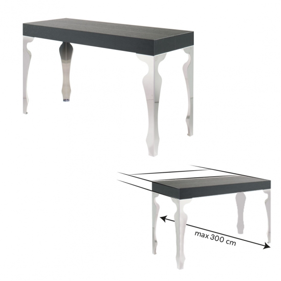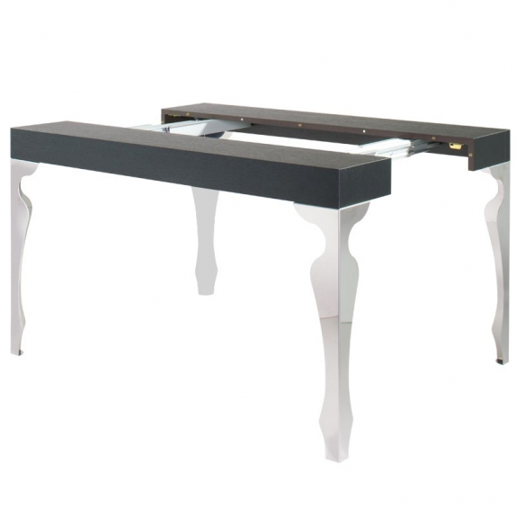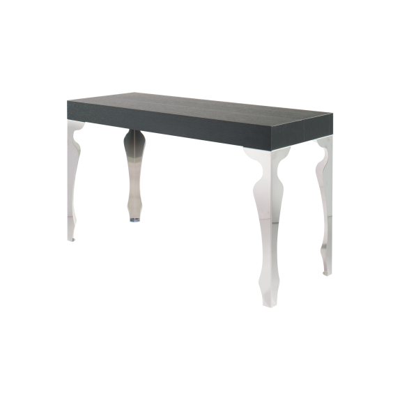 La consolle allungabile Luxury ha il piano in legno e le gambe sagomate in acciaio cromato con meccanismo di estensione in alluminio anodizzato. Sacche per allunghe interne in dotazione.